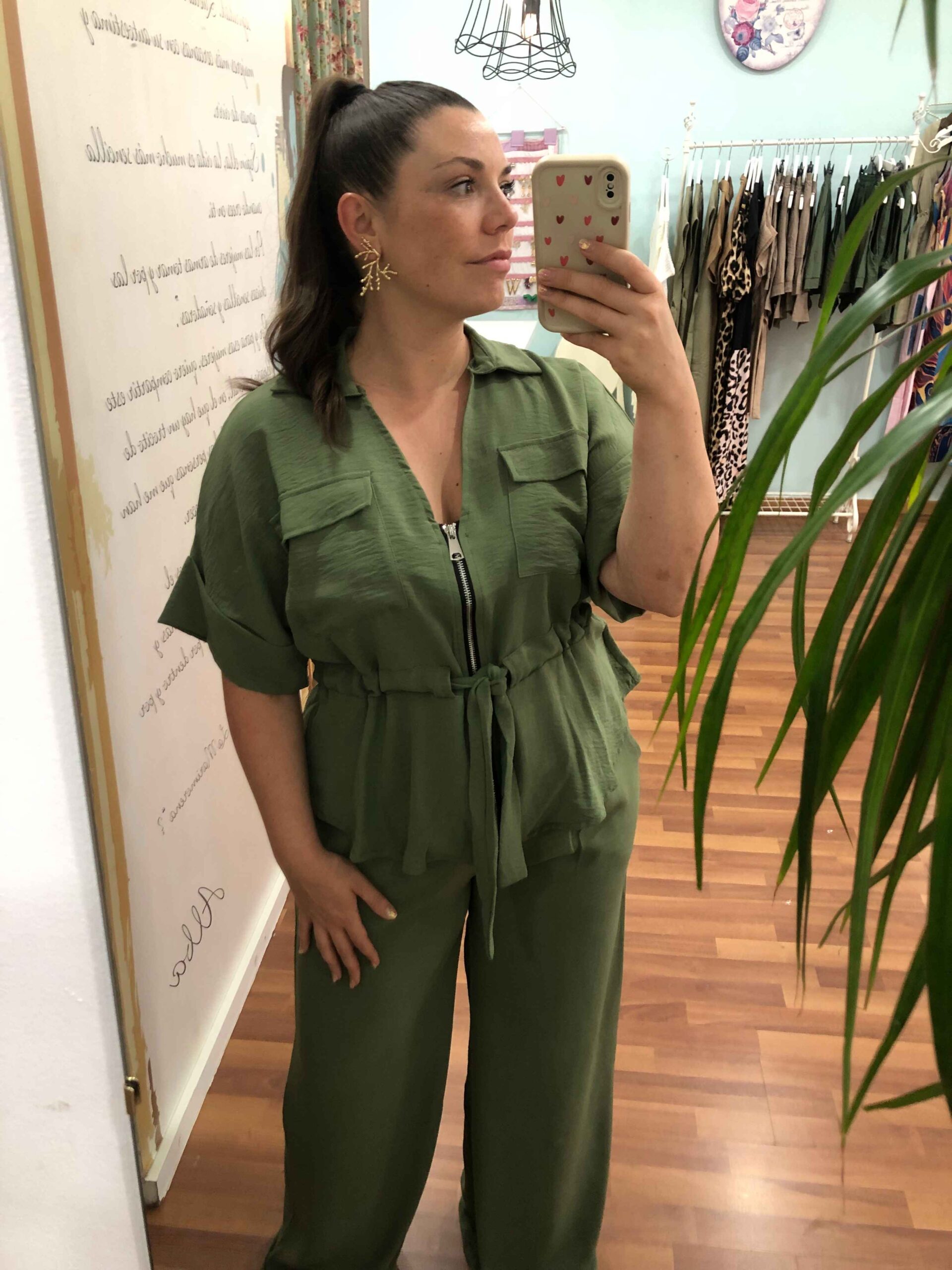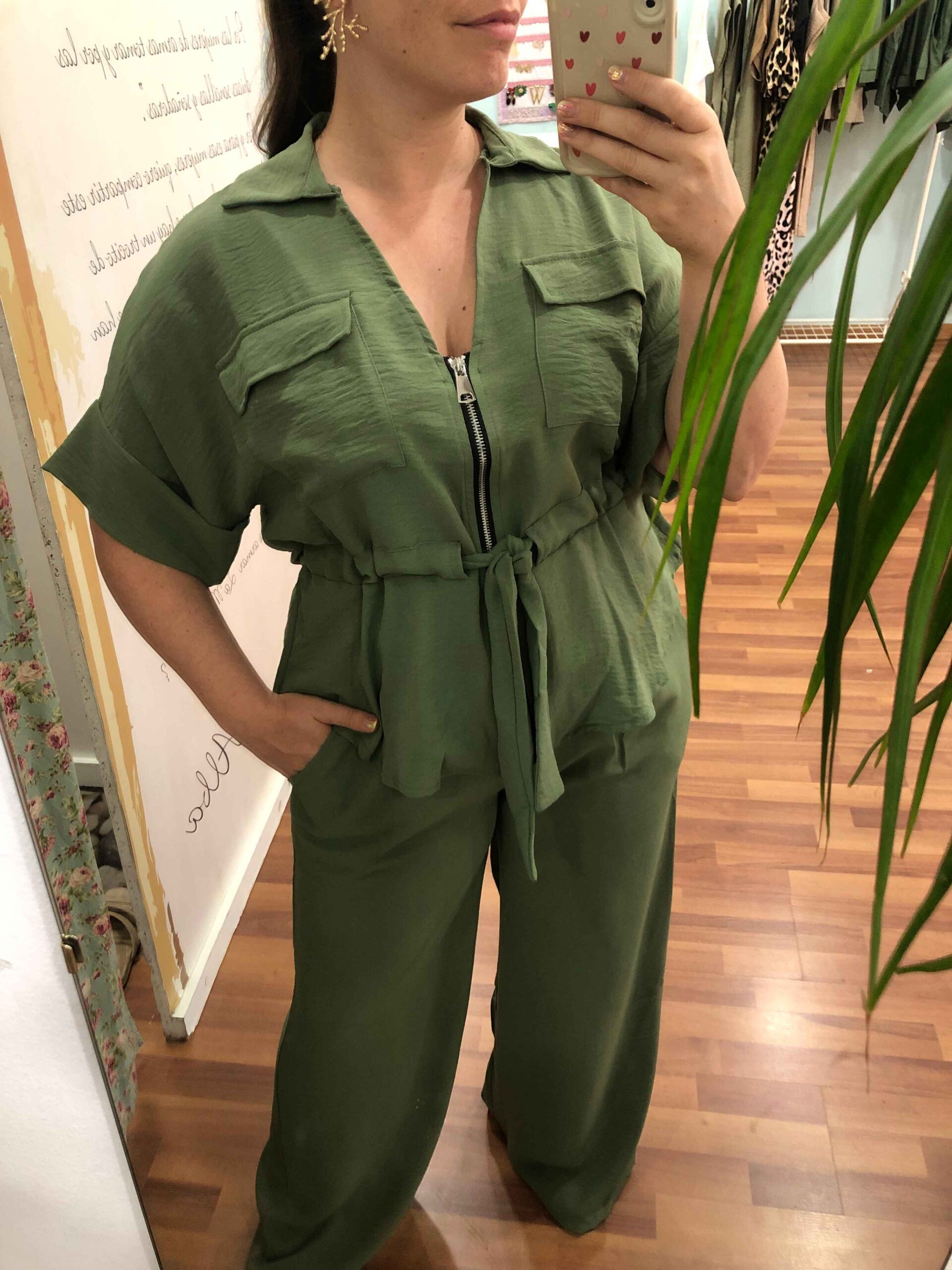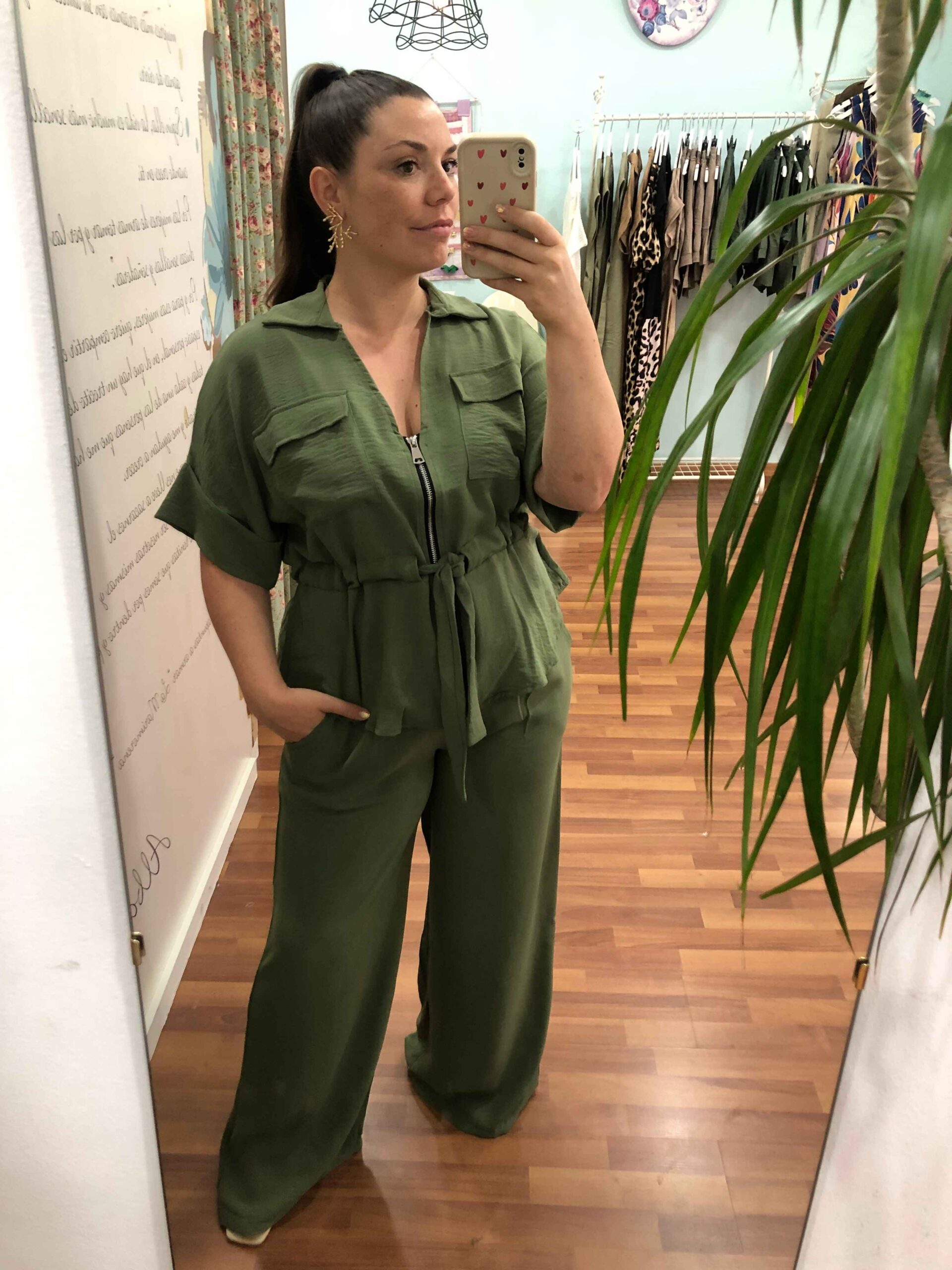 Conjunto chaqueta y pantalón. Tejido fluido. Chaqueta manga corta. Cierre cremallera. Bolsillos solapa. Cintura ajustable. Pantalón tiro alto. Bolsillos laterales. Pernera ancha.